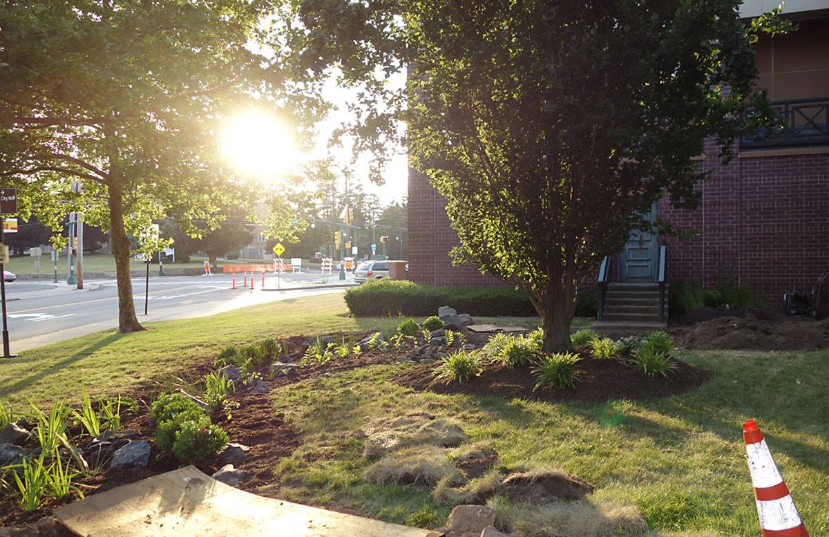 A basin structure captures water and allows it to slowly percolate through the soil, recharging groundwater supplies. Plants and soil microbes filter and break down pollutants preventing them from reaching our drinking water.