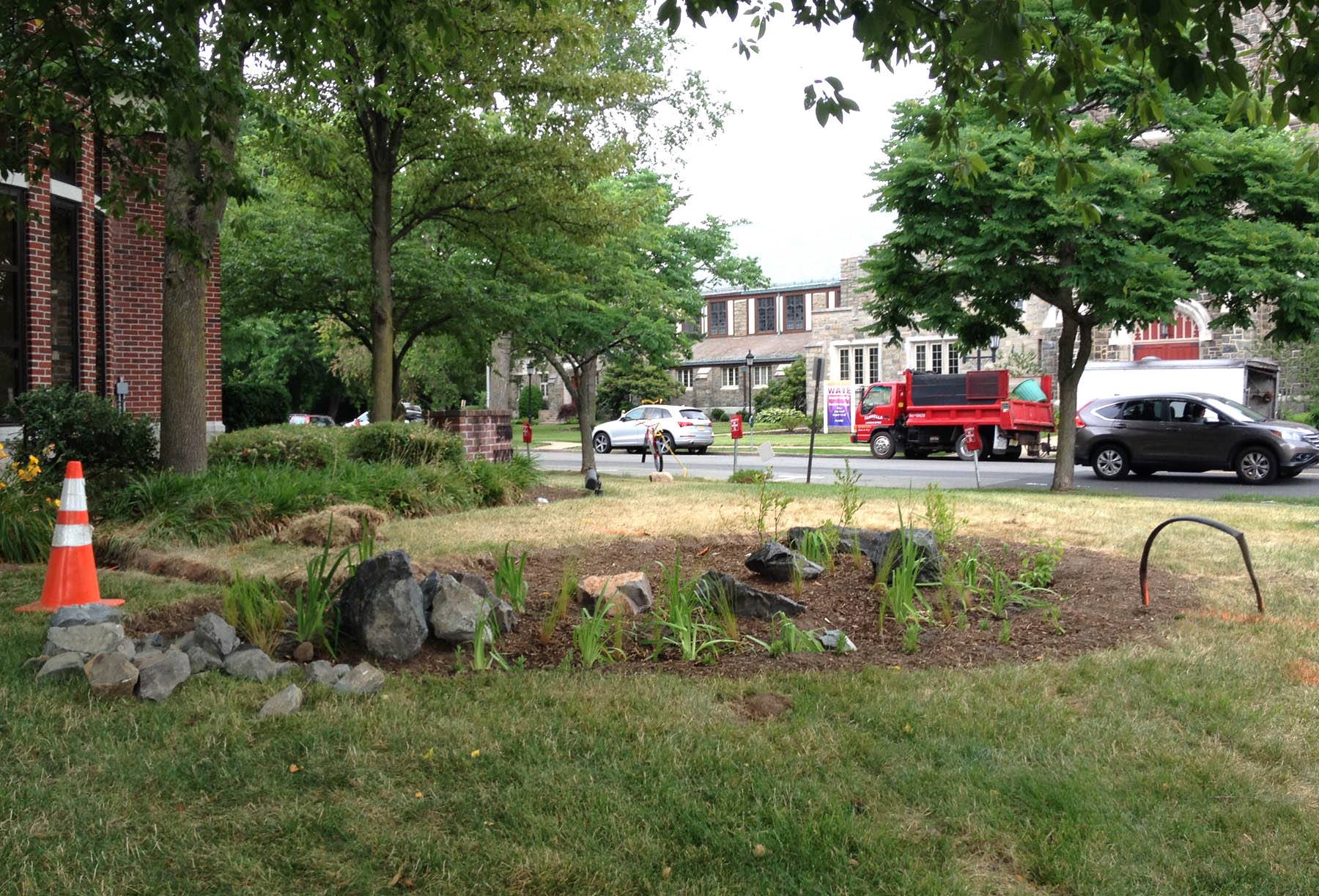 A basin structure captures water and allows it to slowly percolate through the soil, recharging groundwater supplies. Plants and soil microbes filter and break down pollutants preventing them from reaching our drinking water.